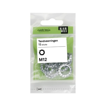 Verzinkte tandveerring. Tandveerringen zijn zelfborgende ringen die het lostrillen van een moer of een bout voorkomen.