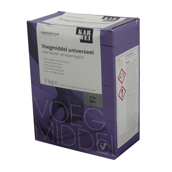 Het KARWEI tegel voegmiddel is een universeel toepasbaar voegmiddel voor keramische wand- en vloertegels met een voegbreedte van 4 tot 10 mm. Het voegmiddel is gemakkelijk aan te maken met leidingwater en kan zowel binnen- als buiten worden toegepast. Tevens is het voegmiddel te gebruiken in vochtige ruimtes. Het verbruik van het voegmiddel is bij een voegbreedte van 4 mm ongeveer 1kg per m2. Met deze doos van 2 kg heb je dan ongeveer voldoende voor ca. 2 m2. Het voegmiddel heeft de kleur grijs.
