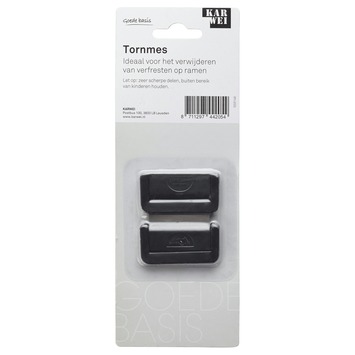 Het KARWEI tornmes 2 stuks zijn multifunctionele mesjes van het KARWEI eigen merk. Ieder tornmesje bestaat uit een eenzijdig geslepen mesje in een kunststofhouder met beschermkapje. Het tornmesje is onder andere geschikt voor het verwijderen van verfspatten op ramen. Kan ook worden gebruikt voor het snijden van touw of papier.