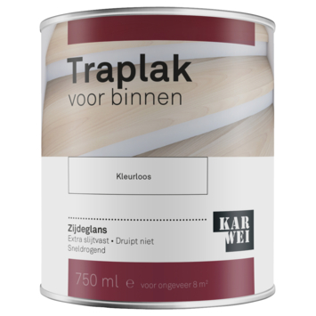 KARWEI traplak 750 ml is een transparante en kleurloze zijdeglans lak op waterbasis. Geschikt voor het beschermen van houten trappen. De traplak is in gelvorm, dit voorkomt zakkers en druipt niet. Aan te brengen over een bestaande laklaag, extra kras-, stoot- en slijtvast, reukarm en sneldrogend. Dit blik van 750 ml is voldoende voor het schilderen van ongeveer 8 m². De lak is stofdroog na 1 uur, overschilderbaar na 4 uur en belastbaar na 24 uur. Is je trap nog onbehandeld? Breng de trap dan eerst op kleur met KARWEI binnenbeits en werk vervolgens af met twee lagen KARWEI traplak voor optimale bescherming.