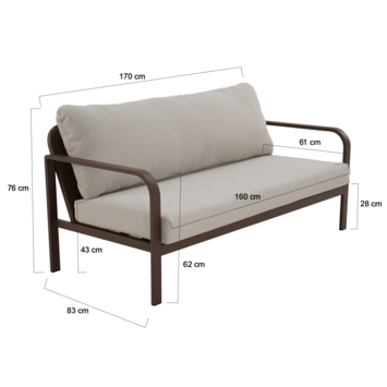 Dankzij de zithoogte van 43 cm en de meegeleverde kussens biedt de tuinbank Bob optimaal zitcomfort. Het bruine metalen frame is stevig en weerbestendig, waardoor de bank bestand is tegen verschillende weersomstandigheden en eenvoudig te verplaatsen is. De bank wordt geleverd als bouwpakket en is gemakkelijk in elkaar te zetten met de bijgeleverde instructies.
