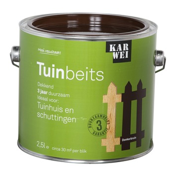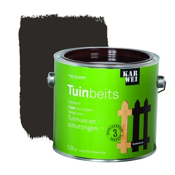 De KARWEI tuinbeits tuinhuis en schuttingen donkerbruin dekkend 2,5 l is ideaal voor het langdurig beschermen van tuinhuizen en schuttingen, ook als ze geïmpregneerd zijn. De beits dringt goed door in het hout en heeft een duurzaamheid van 3 jaar. Hierdoor is de beits uitermate geschikt voor tuinhuizen en schuttingen. Deze glanzende beits is een oplosmiddel houdend product en is weersbestendig, waterafstotend, UV-bestendig en vochtregulerend. Daarnaast heeft de beits een optimale dekking en vloeiing, waardoor het aanbrengen een fluitje van een cent is. Grondverf is niet nodig en je kunt de beits eenvoudig met een kwast of roller aanbrengen. Het blik bevat 2,5 liter dekkende beits in de kleur donkerbruin, dit is goed voor een oppervlakte van zo'n 30 vierkante meter. Op onbehandeld hout is het aan te bevelen om 3 lagen aan te brengen, op hout in goede staat volstaan 2 lagen. De tuinbeits is in diverse dekkende en transparante kleuren verkrijgbaar.