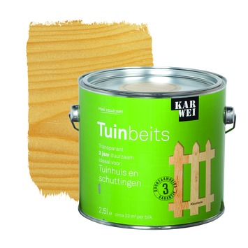 De KARWEI tuinbeits tuinhuis en schuttingen kleurloos transparant 2,5 l is ideaal voor het langdurig beschermen van tuinhuizen en schuttingen, ook als ze geïmpregneerd zijn. De beits dringt goed door in het hout en heeft een duurzaamheid van 3 jaar. Hierdoor is de beits uitermate geschikt voor tuinhuizen en schuttingen. Deze glanzende beits is een oplosmiddel houdend product en is weersbestendig, waterafstotend, UV-bestendig en vochtregulerend. Daarnaast heeft de beits een optimale dekking en vloeiing, waardoor het aanbrengen een fluitje van een cent is. Grondverf is niet nodig en je kunt de beits eenvoudig met een kwast of roller aanbrengen. Het blik bevat 2,5 liter transparante kleurloze beits, dit is goed voor een oppervlakte van zo'n 33 vierkante meter. Op onbehandeld hout is het aan te bevelen om 3 lagen aan te brengen, op hout in goede staat volstaan 2 lagen. De tuinbeits is in diverse dekkende en transparante kleuren verkrijgbaar.