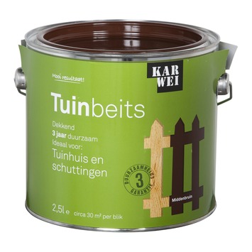 De KARWEI tuinbeits tuinhuis en schuttingen middenbruin dekkend 2,5 l is ideaal voor het langdurig beschermen van tuinhuizen en schuttingen, ook als ze geïmpregneerd zijn. De beits dringt goed door in het hout en heeft een duurzaamheid van 3 jaar. Hierdoor is de beits uitermate geschikt voor tuinhuizen en schuttingen. Deze glanzende beits is een oplosmiddel houdend product en is weersbestendig, waterafstotend, UV-bestendig en vochtregulerend. Daarnaast heeft de beits een optimale dekking en vloeiing, waardoor het aanbrengen een fluitje van een cent is. Grondverf is niet nodig en je kunt de beits eenvoudig met een kwast of roller aanbrengen. Het blik bevat 2,5 liter dekkende beits in de kleur middenbruin, dit is goed voor een oppervlakte van zo'n 30 vierkante meter. Op onbehandeld hout is het aan te bevelen om 3 lagen aan te brengen, op hout in goede staat volstaan 2 lagen. De tuinbeits is in diverse dekkende en transparante kleuren verkrijgbaar.