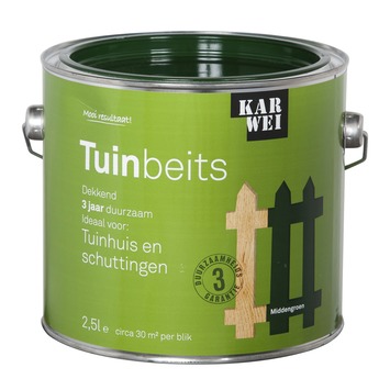 De KARWEI tuinbeits tuinhuis en schuttingen middengroen dekkend 2,5 l is ideaal voor het langdurig beschermen van tuinhuizen en schuttingen, ook als ze geïmpregneerd zijn. De beits dringt goed door in het hout en heeft een duurzaamheid van 3 jaar. Hierdoor is de beits uitermate geschikt voor tuinhuizen en schuttingen. Deze glanzende beits is een oplosmiddel houdend product en is weersbestendig, waterafstotend, UV-bestendig en vochtregulerend. Daarnaast heeft de beits een optimale dekking en vloeiing, waardoor het aanbrengen een fluitje van een cent is. Grondverf is niet nodig en je kunt de beits eenvoudig met een kwast of roller aanbrengen. Het blik bevat 2,5 liter dekkende beits in de kleur middengroen, dit is goed voor een oppervlakte van zo'n 30 vierkante meter. Op onbehandeld hout is het aan te bevelen om 3 lagen aan te brengen, op hout in goede staat volstaan 2 lagen. De tuinbeits is in diverse dekkende en transparante kleuren verkrijgbaar.