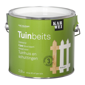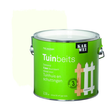 De KARWEI tuinbeits tuinhuis en schuttingen middenwit dekkend 2,5 l is ideaal voor het langdurig beschermen van tuinhuizen en schuttingen, ook als ze geïmpregneerd zijn. De beits dringt goed door in het hout en heeft een duurzaamheid van 3 jaar. Hierdoor is de beits uitermate geschikt voor tuinhuizen en schuttingen. Deze glanzende beits is een oplosmiddel houdend product en is weersbestendig, waterafstotend, UV-bestendig en vochtregulerend. Daarnaast heeft de beits een optimale dekking en vloeiing, waardoor het aanbrengen een fluitje van een cent is. Grondverf is niet nodig en je kunt de beits eenvoudig met een kwast of roller aanbrengen. Het blik bevat 2,5 liter dekkende beits in de kleur middenwit, dit is goed voor een oppervlakte van zo'n 30 vierkante meter. Op onbehandeld hout is het aan te bevelen om 3 lagen aan te brengen, op hout in goede staat volstaan 2 lagen. De tuinbeits is in diverse dekkende en transparante kleuren verkrijgbaar.