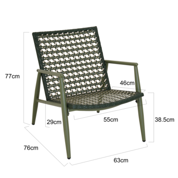 De KARWEI tuinstoel Guus in groen biedt een perfecte combinatie van robuustheid en stijl. Het frame van metaal en wicker zorgt voor zowel stevigheid als een moderne uitstraling, waardoor deze stoel een mooie toevoeging is aan elke tuin of terras. De zithoogte van 38,5 cm zorgt voor optimaal comfort, of je nu ontspant of een goed gesprek voert.