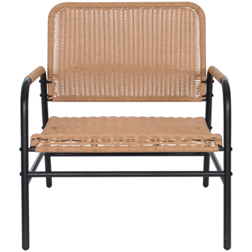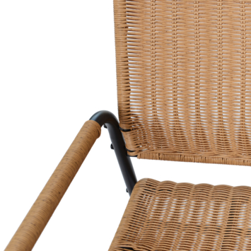 De zitting is gemaakt van natural polyethyleen, wat zorgt voor een sterke en weerbestendige afwerking, terwijl het zwarte metalen onderstel stabiliteit en een moderne uitstraling toevoegt. De natuurlijke kleur maakt deze stoel eenvoudig te combineren met diverse tuinmeubelen, van klassiek tot eigentijds.