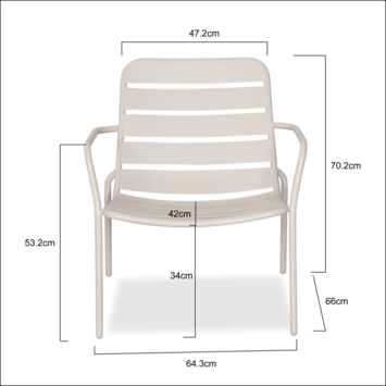 De stoel wordt geleverd zonder kussens, maar je kunt deze naar wens toevoegen voor extra comfort en stijl. Dankzij het stevige frame is de stoel ontworpen om jarenlang mee te gaan. De zandkleurige afwerking geeft de stoel een subtiele, natuurlijke uitstraling die perfect past bij verschillende tuinstijlen en zorgt voor een ontspannen sfeer in je tuin.