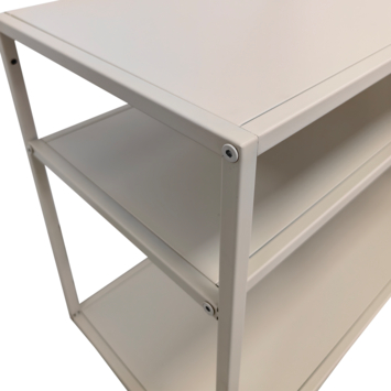 Prachtig meubel, ik lees hier in de reviews over niet passende schroeven. Echt geen last van, en ik ben niet zo handig. Mooie, heel licht grijze kleur, net van het wit af. Wordt hier gebruikt als side table.