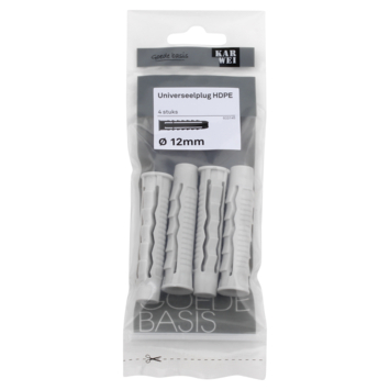 De KARWEI Universeelplug HDPE Ø 12mm is voor meerdere materialen te gebruiken De plug is zowel geschikt voor beton, massieve als geperforeerde steen, en ook voor holle wanden. De kop van de plug wordt namelijk door de schroef naar achteren getrokken en vormt in holle bouwmaterialen een soort knoop. Een handige plug dus om op voorraad te hebben, zodat je altijd een geschikte plug in huis hebt. De plug is 60mm lang, voor het beste resultaat adviseren wij een minimale boordiepte te hanteren van 70mm . Een verpakking bevat 4 pluggen. Deze plug is geschikt voor schroeven tussen 8 en 10mm met een minimale lengte van 65mm