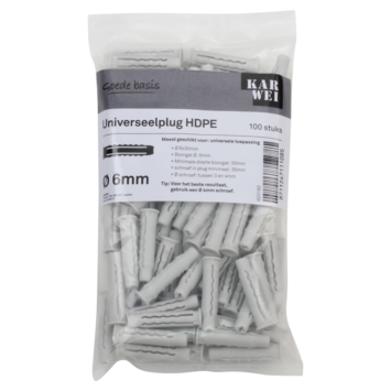 De KARWEI Universeelplug HDPE Ø 6mm is voor meerdere materialen te gebruiken De plug is zowel geschikt voor beton, massieve als geperforeerde steen, en ook voor holle wanden. De kop van de plug wordt namelijk door de schroef naar achteren getrokken en vormt in holle bouwmaterialen een soort knoop. Een handige plug dus om op voorraad te hebben, zodat je altijd een geschikte plug in huis hebt. De plug is 30mm lang, voor het beste resultaat adviseren wij een minimale boordiepte te hanteren van 35mm . Een verpakking bevat 100 pluggen. Deze plug is geschikt voor schroeven tussen 3 en 4mm met een minimale lengte van 35mm