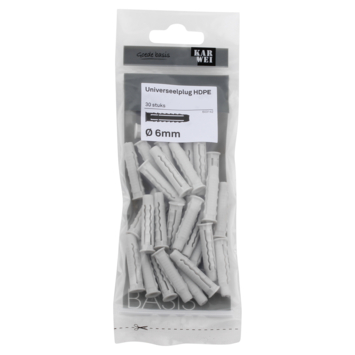 De KARWEI Universeelplug HDPE Ø 6mm is voor meerdere materialen te gebruiken De plug is zowel geschikt voor beton, massieve als geperforeerde steen, en ook voor holle wanden. De kop van de plug wordt namelijk door de schroef naar achteren getrokken en vormt in holle bouwmaterialen een soort knoop. Een handige plug dus om op voorraad te hebben, zodat je altijd een geschikte plug in huis hebt. De plug is 30mm lang, voor het beste resultaat adviseren wij een minimale boordiepte te hanteren van 35mm . Een verpakking bevat 30 pluggen. Deze plug is geschikt voor schroeven tussen 3 en 4mm met een minimale lengte van 35mm