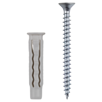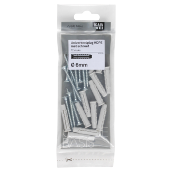 De KARWEI Universeelplug HDPE Ø 6mm met schroef is voor meerdere materialen te gebruiken De plug is zowel geschikt voor beton, massieve als geperforeerde steen, en ook voor holle wanden. De kop van de plug wordt namelijk door de schroef naar achteren getrokken en vormt in holle bouwmaterialen een soort knoop. Een handige plug dus om op voorraad te hebben, zodat je altijd een geschikte plug in huis hebt. De plug is 30mm lang, voor het beste resultaat adviseren wij een minimale boordiepte te hanteren van 35mm . Een verpakking bevat 12 pluggen met 0 35mm