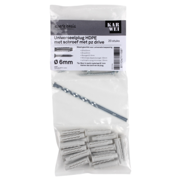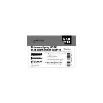 De KARWEI Universeelplug HDPE Ø 6mm met schroef is voor meerdere materialen te gebruiken De plug is zowel geschikt voor beton, massieve als geperforeerde steen, en ook voor holle wanden. De kop van de plug wordt namelijk door de schroef naar achteren getrokken en vormt in holle bouwmaterialen een soort knoop. Een handige plug dus om op voorraad te hebben, zodat je altijd een geschikte plug in huis hebt. De plug is 30mm lang, voor het beste resultaat adviseren wij een minimale boordiepte te hanteren van 35mm . Een verpakking bevat 20 pluggen met 0 35mm