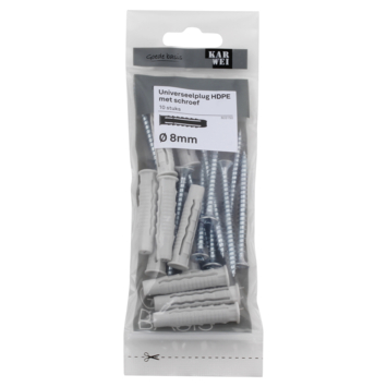 De KARWEI Universeelplug HDPE Ø 8mm met schroef is voor meerdere materialen te gebruiken De plug is zowel geschikt voor beton, massieve als geperforeerde steen, en ook voor holle wanden. De kop van de plug wordt namelijk door de schroef naar achteren getrokken en vormt in holle bouwmaterialen een soort knoop. Een handige plug dus om op voorraad te hebben, zodat je altijd een geschikte plug in huis hebt. De plug is 40mm lang, voor het beste resultaat adviseren wij een minimale boordiepte te hanteren van 45mm . Een verpakking bevat 10 pluggen met 0 45mm