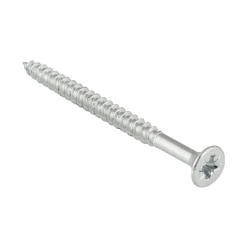 Verzinkte universeel schroef met platverzonken-kop en pozi aandrijving. De schroef is voorzien van een waslaag t. b. v. een betere verwerking