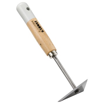 - Met een blank gehard stalen en schuin geslepen driehoekige kop met gelakt houten steel