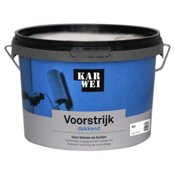 KARWEI voorstrijk dekkend wit 2,5 liter voor binnen en buiten is een dekkende voorstrijk / primer voor ondergronden die worden geschilderd met plafond- of muurverf. Vermindert de zuiging van de ondergrond, geeft een betere dekking en hechting van de verf en voorkomt kleur en glansverschillen van de eindlaag. De watergedragen voorstrijk is sneldrogend.