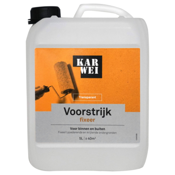 KARWEI voorstrijk fixeer 5 liter is een transparante voorstrijk / primer voor het fixeren van poederende en krijtende ondergronden. Zorgt voor een betere dekking en hechting van de verf. Vermindert de zuiging van de ondergrond. De watergedragen voorstrijk is sneldrogend. Voor binnen- en buitengebruik. Gebruik KARWEI voorstrijk Fixeer in combinatie met KARWEI dekkende voorstrijk voor een optimaal resultaat.