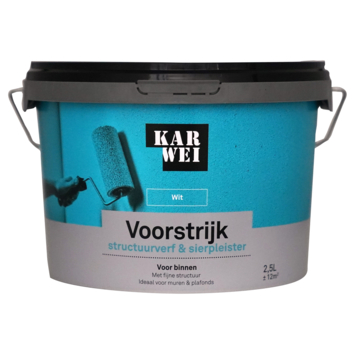 KARWEI voorstrijk structuurverf en sierpleister wit 2,5 liter is een dekkende voorstrijk / primer met een fijne structuur. Voor muren en plafonds die worden afgewerkt met structuurverf, structuurpleister of korrelpleister. Zorgt voor een uitstekende hechting van de eindlaag. Ook vermindert het de zuiging van de ondergrond. De watergedragen voorstrijk is sneldrogend. Voor binnengebruik.