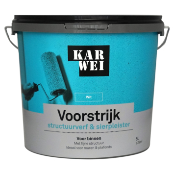 KARWEI voorstrijk structuurverf en sierpleister wit 5 liter is een dekkende voorstrijk / primer met een fijne structuur. Voor muren en plafonds die worden afgewerkt met structuurverf, structuurpleister of korrelpleister. Zorgt voor een uitstekende hechting van de eindlaag. Ook vermindert het de zuiging van de ondergrond. De watergedragen voorstrijk is sneldrogend. Voor binnengebruik.