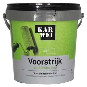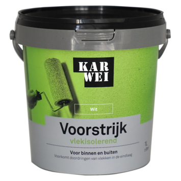 KARWEI voorstrijk vlek isolerend wit 1 liter is een dekkende voorstrijk / primer voor het behandelen van vervuiling op muren en plafonds. Voor het afsluiten van vochtvlekken en kringen, roet en nicotineaanslag. Voorkomt dat de vlekken doordringen in de eindlaag. Voor binnen en buitengebruik. Wacht 24 uur met het aanbrengen van de tweede laag. Voor optimaal dekkend resultaat behandel je de volledige muur vervolgens met een KARWEI Dekkende voorstrijk.