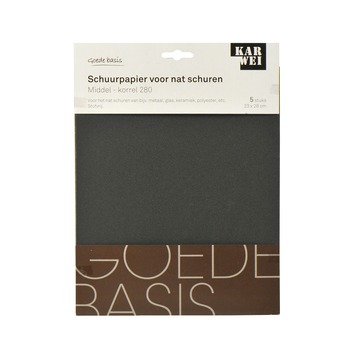 Het KARWEI waterproof schuurpapier 230x280mm middel 5 stuks is schuurpapier van het KARWEI eigen merk. Het schuurpapier is onder andere geschikt voor het nat schuren van metaal, glas, keramiek of polyester. Het schuurpapier kan zowel met de hand, een schuurblok of schuurmachine gebruikt worden. De set bevat 5 schuurvellen met een middel fijne korrel (K280) en heeft een afmeting van 23 x 28 centimeter.