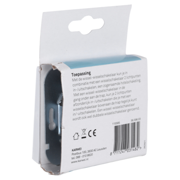 KARWEI Zenith wissel-wisselschakelaar wit, ook wel dubbele wisselschakelaar genoemd, kan gebruikt worden voor het maken van een hotelschakeling. Gebruik de wissel-wisselschakelaar bijvoorbeeld onder aan de trap, 1 druk op de knop voor het licht in de gang en de andere voor het licht boven. Vervolgens kun je boven het licht weer uitdoen met een wisselschakelaar.