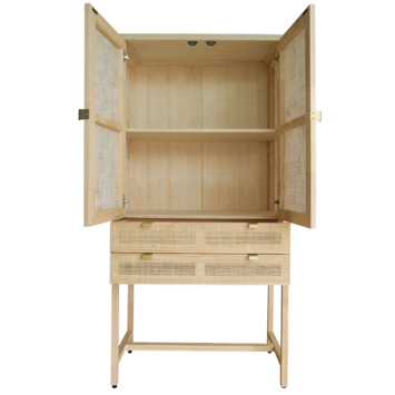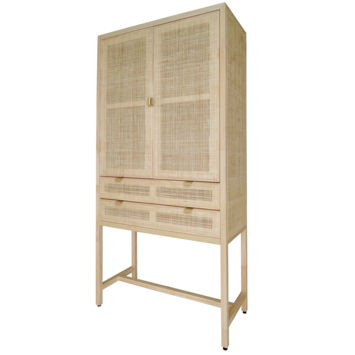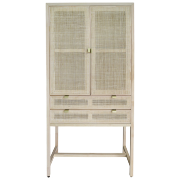 Deze Nero webbing kast is een prachtig exemplaar met 2 deuren, 2 lades. Achter de deuren is een plank opgenomen om nog meer spulletjes in op te bergen. Kleur is natural, ook verkrijgbaar in zwart. Webbing is weer helemaal trendy dit jaar. Terug van weggeweest, klaar om te blijven. Webbing is een soort gevlochten riet, wat het een zeer duurzaam, stijlvol en universeel materiaal maakt.