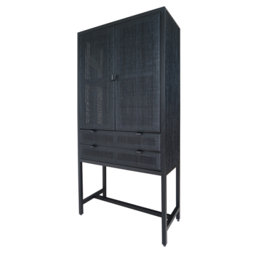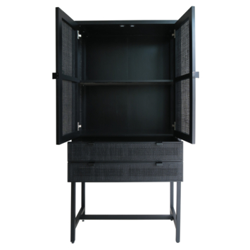 Deze Nero webbing kast is een prachtig exemplaar met 2 deuren, 2 lades. Achter de deuren is een plank opgenomen om nog meer spulletjes in op te bergen. Kleur is zwart ook verkrijgbaar in naturel. Webbing is weer helemaal trendy dit jaar. Terug van weggeweest, klaar om te blijven. Webbing is een soort gevlochten riet, wat het een zeer duurzaam, stijlvol en universeel materiaal maakt. Haal dus snel deze trendy eyecatcher in huis!