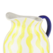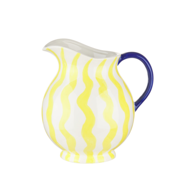 Met deze prachtige keramische waterkan voeg je een vleugje kleurrijke charme toe aan je interieur. De waterkan is uitgevoerd in een streeppatroon in de kleuren geel, blauw en wit, wat zorgt voor een speelse en eigentijdse uitstraling. De kan is groot genoeg voor het serveren van dranken of puur als decoratief pronkstuk. Perfect voor elke keuken, eetkamer of woonruimte die een uniek accent nodig heeft.