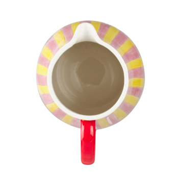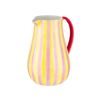 Met deze prachtige keramische waterkan voeg je een vleugje kleurrijke charme toe aan je interieur. De waterkan is uitgevoerd in een streeppatroon in de kleuren oranje, blauw en geel, wat zorgt voor een speelse en eigentijdse uitstraling. De kan is groot genoeg voor het serveren van dranken of puur als decoratief pronkstuk. Perfect voor elke keuken, eetkamer of woonruimte die een uniek accent nodig heeft.