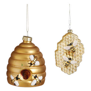 Op zoek naar originele kerstboom decoratie? Ga voor deze leuke set! De ornamenten zijn gemaakt van glas en feestelijk met glitter afgewerkt. De set bestaat uit twee ornamenten in de vorm van een bijenkorf en in een honingraat. Het ornament is tot in detail nagemaakt. Door middel van het touwtje kun je het ornament gemakkelijk ophangen, bijvoorbeeld in de kerstboom. Een grappige toevoeging! Ook leuk om als kerstcadeau aan iemand te geven. De afmetingen zijn L10,5 x B6 x H2,5 cm.