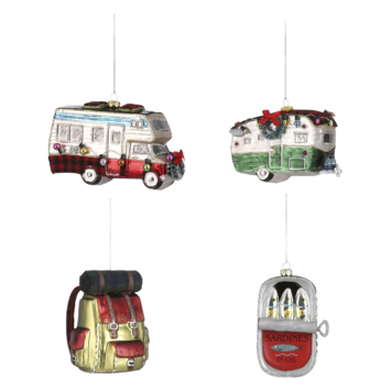 Op zoek naar originele kerstboom decoratie? Ga voor deze leuke glamping ornamenten! De ornamenten zijn gemaakt van glas en feestelijk met glitter afgewerkt. De set bestaat uit een camper, caravan, rugzak en een blikje met sardines. Door middel van het touwtje kun je het ornament gemakkelijk ophangen, bijvoorbeeld in de kerstboom. Een grappige toevoeging voor de echte kampeerliefhebber! De afmetingen zijn L9,5 x B7,5 x H12 cm.
