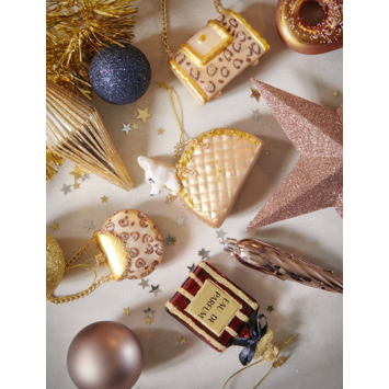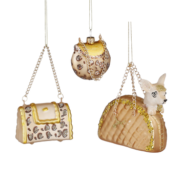 Op zoek naar originele kerstboom decoratie? Ga voor deze luxe handtassen set! De ornamenten zijn gemaakt van glas en feestelijk met glitter afgewerkt. De set bestaat uit drie ornamenten in de vorm van een luxe tas. Een grappige toevoeging voor de echte liefhebber van handtassen! Door middel van het touwtje kun je het ornament gemakkelijk ophangen, bijvoorbeeld in de kerstboom. Ook leuk om als kerstcadeau aan iemand te geven. De afmetingen zijn L8,5 x B3,5 x H8 cm.