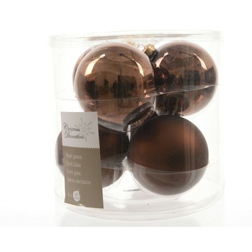 Echt glazen kerstbal Ø 8 cm in de kleur truffel (brons) in glans en mat uitvoering per 6 stuks gemixed in een transparante kunststof box (3 glanzend en 3 in een matte uitvoering). Deze fraaie moderne truffel (brons) kleur kan heel mooi gecombineerd worden met de echt glazen kerstballen in kleuren wolwit en amandel. Om deze kleurstijl helemaal compleet te maken kun je deze kerstballen combineren met kerstversiering in wit porselein en diverse andere koperkleurige kerstversiering.
