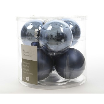 Echt glazen kerstbal Ø 8 cm in de kleur jeans blauw in glans en mat uitvoering per 6 stuks gemixed in een transparante kunststof box (3 glanzend en 3 in een matte uitvoering). Deze fraaie moderne blauwtint kan heel mooi gecombineerd worden met de echt glazen kerstballen in kleur winterwit of wolgrijs. Om deze kleurstijl helemaal compleet te maken kun je deze kerstballen combineren met kerstversiering in wit tinten.