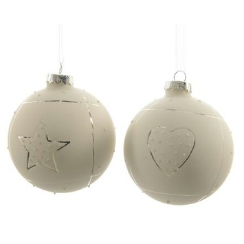 Echt glazen kerstbal 8 cm in de kleur mat wit met een decoratie van een ster of een hartvorm. Voor het ophangen wordt een witte organza linthanger mee verpakt. Deze luxe kerstballen, een set van 3 stuks, zijn verpakt in een kartonnen doos met een kunststof tranparant deksel. Combineer deze kerstballen met koper en wolwitte glazen kerstballen of met kerstversiering in natuurtinten.
