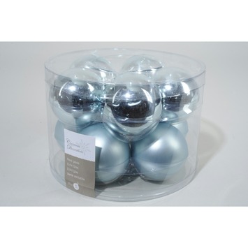 Echt glazen kerstbal van 6 cm in de kleur hemelsblauw in glans en mat uitvoering per 10 stuks gemixed in een transparante kunststof box (5 glanzend en 5 in een matte uitvoering). Deze fraaie pasteltint kan heel mooi gecombineerd worden met de echt glazen kerstballen in kleuren zacht roze, zilver en klei. Om deze kleurstijl helemaal compleet te maken kun je deze kerstballen combineren met kerstversiering in het wit zoals porselein ornamenten en diverse natuurtinten gecombineerd met wit.