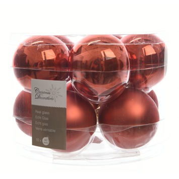 Echt glazen kerstbal van 6 cm in de kleur herfst rood in glans en mat uitvoering per 10 stuks gemixed in een transparante kunststof box (5 glanzend en 5 in een matte uitvoering). Deze fraaie moderne herfst rode kleur kan heel mooi gecombineerd worden met de echt glazen kerstballen in diverse kleuren. Om de kerst binnen en buiten helemaal compleet te maken kun je deze kerstballen combineren met diverse kerstversiering en kerstverlichting.