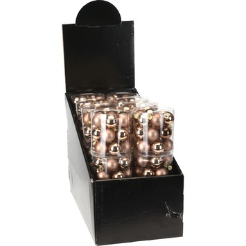 Echte glazen kleine kerstballen Ø 3cm. Deze kleine kerstballen worden in een set van 18 stuks verkocht en zijn in het koper gemixt. Deze kerstballetjes zijn ook verkrijgbaar in het roze en koper. Om de kerst binnen en buiten helemaal compleet te maken kun je deze kerstballen combineren met diverse kerstversiering en kerstverlichting.