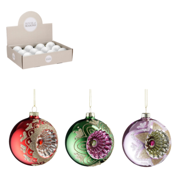 Op zoek naar originele kerstdecoratie? Ga voor deze kerstbal met sierlijke gouden glitter. De kerstbal van glas is verkrijgbaar in drie feestelijke kleur varianten; rood, groen en roze/paars. Door middel van het touwtje kun je hem gemakkelijk ophangen. Bijvoorbeeld als sierlijke toevoeging in de kerstboom! De afmetingen van de hanger zijø8 cm. Ook leuk om te combineren met meerdere glazen kerstballen.