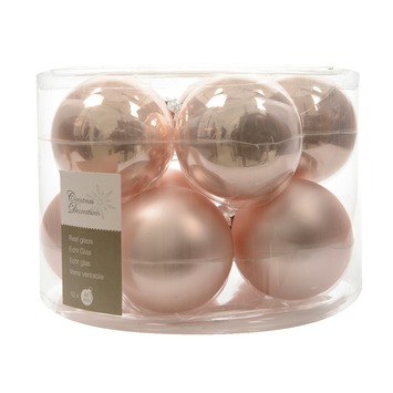 Echt glazen kerstbal van 6 cm in de kleur zacht roze in glans en mat uitvoering per 10 stuks gemixed in een transparante kunststof box (5 glanzend en 5 in een matte uitvoering). Deze fraaie pasteltint kan heel mooi gecombineerd worden met de echt glazen kerstballen in kleuren winterwit, zilver en wolgrijs. Om deze kleurstijl helemaal compleet te maken kun je deze kerstballen combineren met kerstversiering in het wit zoals porselein ornamenten en diverse natuurtinten gecombineerd met wit.