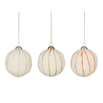 Deze kerstbal heeft een witte basiskleur met verticale, gekleurde strepen. De kerstdecoratie, gemaakt van gerecycled papier, is verkrijgbaar in de kleuren goud, zilver en perzik. Hij heeft een diameter van 8 cm en past daarom perfect in iedere kerstboom! Combineer ze met elkaar of kies voor één kleur.