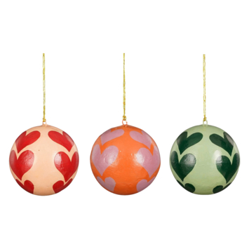 Versier je kerstboom met deze kleurrijke kerstballen met hartjesprint, verkrijgbaar in beige-rood, oranje-paars en lichtgroen-donkergroen. Deze ornamenten, gemaakt van Papier-maché, hebben een hoogte en diameter van 8 cm, en voegen een vrolijke en unieke touch toe aan je kerstdecoratie.