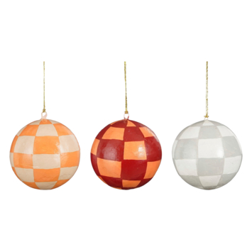 Versier je kerstboom met deze kleurrijke kerstballen met geblokte print, verkrijgbaar in oranje, roze-rood en grijs. Deze ornamenten, gemaakt van Papier-maché, hebben een hoogte en diameter van 8 cm, en voegen een vrolijke en unieke touch toe aan je kerstdecoratie.