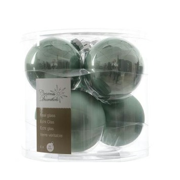 Echt glazen kerstbal van 8 cm in de kleur eucalyptus (pastel grijsgroen) in glans en mat uitvoering per 6 stuks gemixed in een transparante kunststof box (3 glanzend en 3 in een matte uitvoering). Deze fraaie nieuwe eucalyptus kleur in kerstballen kan heel mooi gecombineerd worden met de echt glazen kerstballen in kleuren zilver, winterwit of bevroren blauw. Om deze kleurstijl helemaal compleet te maken kun je deze kerstballen combineren met kerstversiering in het wit zoals porselein ornamenten en diverse natuurtinten gecombineerd met bijvoorbeeld wit.
