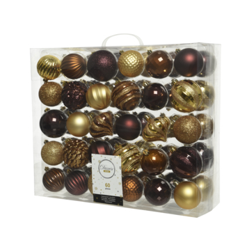 Met dit prachtige pakket van maar liefst 60 kerstballen is jouw boom in een handomdraai prachtig versierd. Dit pakket bestaat uit verschillende vormen en zijn uitgevoerd in mooie warme tinten als goud, kaneel en mahonie. De kerstballen zijn gemaakt van kunststof waardoor ze zo goed als onbreekbaar zijn. Door de rijke decoratie zijn ze nauwelijks van glas te onderscheiden.