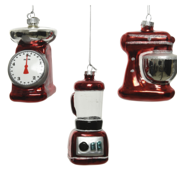 Ben je een keukenprins of prinses en wil je even iets anders in de kerstboom dan kerstballen of kralenkettingen? Deze glazen hanger is een vrolijke en opvallende kerstboomversiering. Verkrijgbaar in een weegschaal, blender of mixer. Deze boomdecoratie komt met een hangertje, zodat je meteen kunt starten met decoreren.